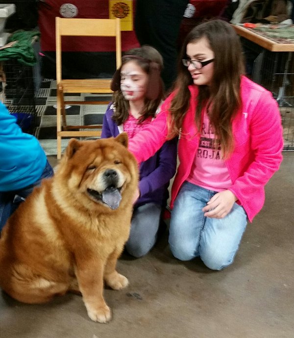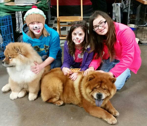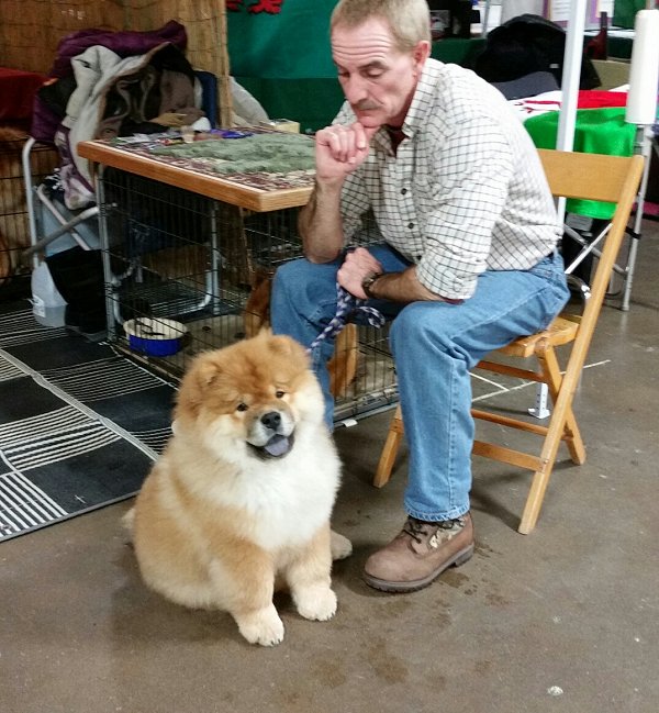 The day started out snowing, cold and slow. Cindy Green brought her 8 month old chow Bella (black rough) and adult Athena (red rough) and Scott and I brought 4 month old Tuffie (red rough), Bingo (red smooth) and Sam the old timer (red smooth). We had grooming demos and many people stopped to visit with the chows and have their photos taken with them. There were many questions asked, the most common were... why is a chow's tongue blue/black, where did they come from, do they need a lot of grooming and why are the coats so different? Sam and Tuffie were in a group parade in the afternoon. They had the breeds enter the main ring one breed at a time by Groups and give a little info on the breed and the names of the dogs. There were many spectators ring side admiring all the lovely dogs and clapping in appreciation.